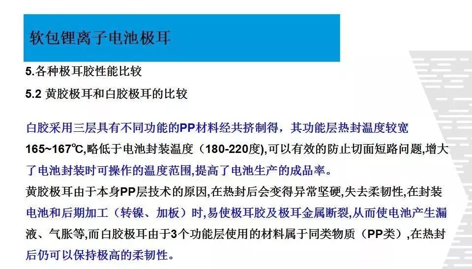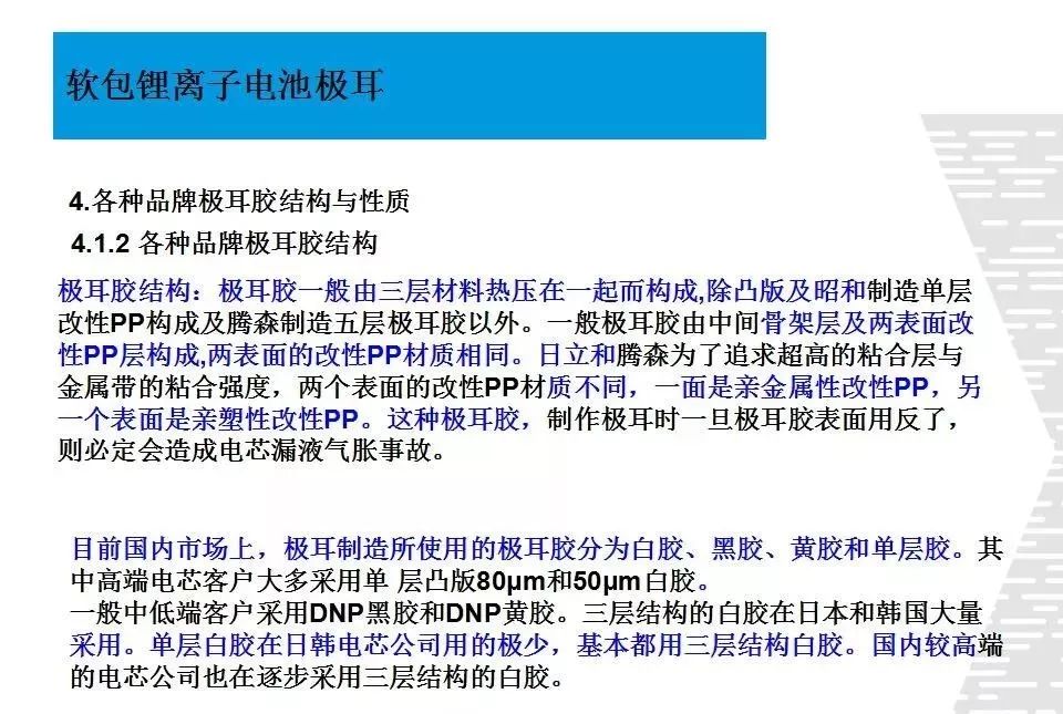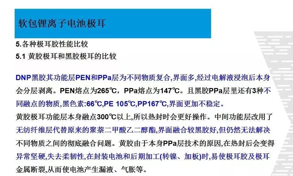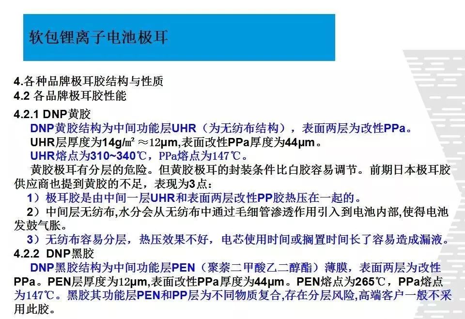黄胶极耳有分层的危险。但黄胶极耳的封装条件比白胶容易调节。前期日本极耳胶供应商也提到黄胶的不足,表现为三点: