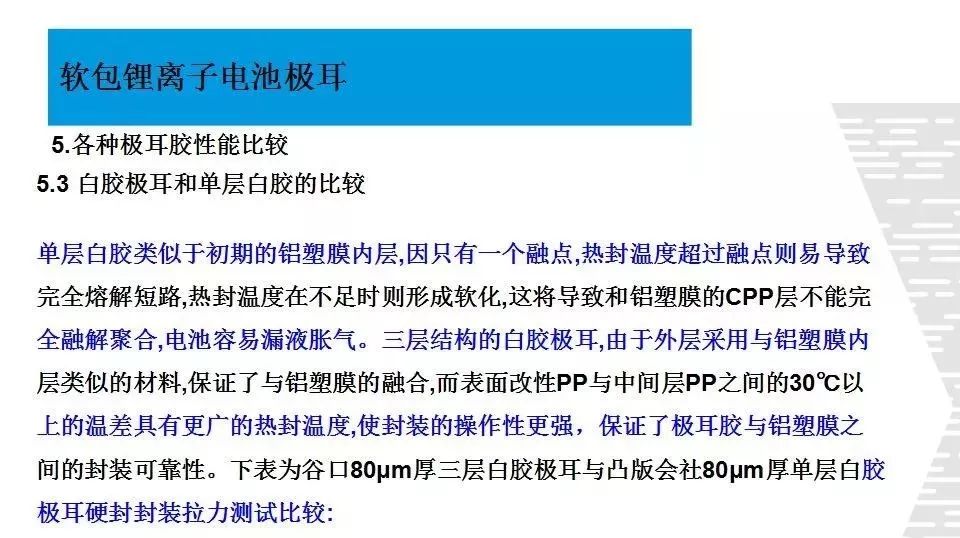 单层白胶类似于初期的铝塑膜内层,因只有一个融点,热封温度超过融点则易导致完全熔解短路,热封温度在不足时则形成软化,这将导致和铝塑膜的CPP层不能完全融解聚合,电池容易漏液胀气。三层结构的白胶极耳,由于外层采用与铝塑膜内层类似的材料,保证了与铝塑膜的融合,而表面改性PP与中间层PP之间的30℃以上的温差具有更广的热封温度,使封装的操作性更强,保证了极耳胶与铝塑膜之间的封装可靠性。下表为谷口80μm厚三层白胶极耳与凸版会社80μm厚单层白胶极耳硬封封装拉力测试比较: