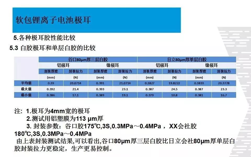 下表为谷口100μm厚三层白胶极耳与日立100μm厚三层白胶(分正反面)极耳及滕森105 μm厚五层白胶(分正反面)极耳软封封装拉力测试比较:
