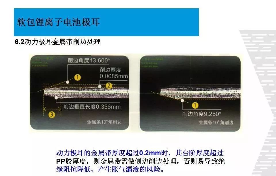 动力极耳的金属带厚度超过0.2mm时,其台阶厚度超过PP胶厚度,则金属带需做侧边削边处理,否则易导致绝缘阻抗降低、产生胀气漏液的风险。