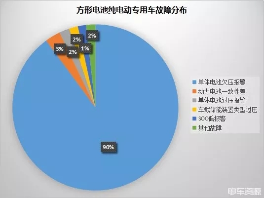 单体电池欠压报警是采用方形动力电池的纯电动专用车的主要故障来源,占比89.9%。