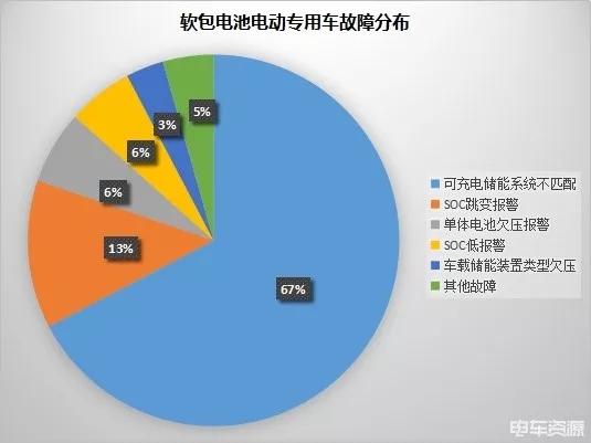 可充电储能系统不匹配、SOC跳变报警、单体电池欠压报警、SOC低报警和车载储能装置类型欠压为软包电池纯电动专用车的主要故障来源,五类故障占总故障量的95.6%。