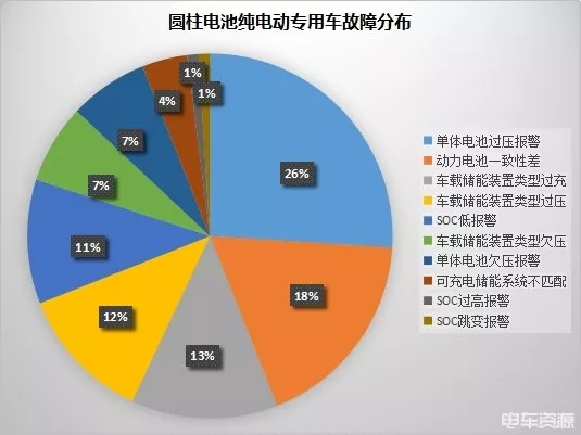 单体电池过压报警、动力电池一致性差、车载储能装置类型过充、车载储能装置类型过压和SOC低报警为圆柱电池纯电动专用车主要故障来源,五类故障占总故障量的81%。