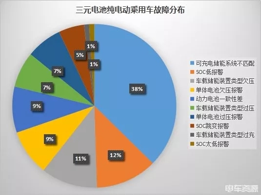 三元材料动力电池纯电动乘用车的主要故障来源为:可充电储能系统不匹配、SOC低报警、车载储能装置类型欠压、单体电池欠压报警、动力电池一致性差等。这五类故障占总故障量的78%。