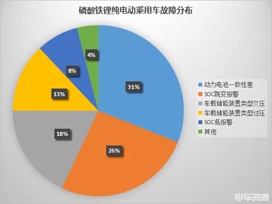 采用磷酸铁锂动力电池的纯电动乘用车,动力电池一致性差、SOC跳变报警、车载储能装置类型欠压、车载储能装置类型过压、SOC低报警为主要故障来源,这五类故障占故障总量的96%。
