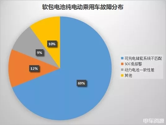 可充电储能系统不匹配、SOC低报警、动力电池一致性差是采用软包动力电池的纯电动乘用车主要故障来源,这三项故障占总量的90%。