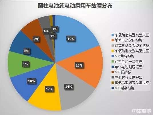 采用圆柱形动力电池的纯电动乘用车,车载储能装置类型欠压、单体电池欠压报警、可充电储能系统不匹配、车载储能装置类型过压、SOC跳变报警为主要故障来源,这五类故障占总故障量的70%。