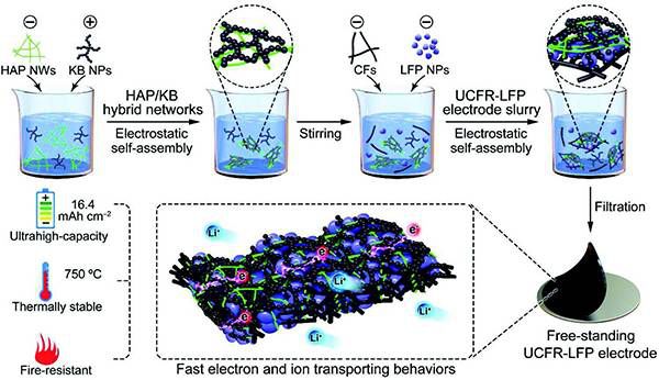 Prof. Yingjie Zhu和Xianluo Hu合作[3],采用羟基磷灰石超长纳米线、科琴黑纳米颗粒,碳纤维和磷酸铁锂粉末作为原料,通过简单的静电辅助自组装的方法成功的制备了一种既可以耐高温、又具有活性物质高负载量的新型磷酸铁锂复合电极(UCFR-LFP),可以作为锂电池正极(图1)。在自组装和抽滤的过程中,磷酸铁锂纳米颗粒均匀得分散在高导电性且多孔的羟基磷灰石超长纳米线/科琴黑纳米颗粒/碳纤维基底中,从而形成自支撑、具有独特复合多孔结构的磷酸铁锂耐高温正极材料,其具有优异的热稳定性和耐火性,即使在1000℃的高温下也能保持其电化学活性和结构完整性。