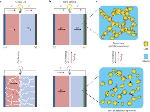 Prof. Zhenan Bao和Yi Cui强强联合[4],报道了一种可有效防止锂电池过热起火的新技术,他们想在情况不可收拾之前关闭电池,通过在锂电池中增加一个热敏高分子聚合物薄膜“开关”材料,当电池温度过高就会迅速切断电池内电路,使之降温;当温度降至正常,该聚合物薄膜又能恢复正常状态,让电池重新工作(图2)。他们将具有石墨烯涂层的镍钠米粒子嵌入聚乙烯材料中,制备出一种轻薄又具有柔性的导电塑料薄,用这种聚合物膜组装成的锂电池,在正常的工作温度下,电流很容易通过薄膜,电池可以正常充电和放电,但是当电池的温度升高到70℃时,聚乙烯开始膨胀,推动镍纳米粒子彼此分开,这样隔膜的导电性在短短的1s之内就会降低1000亿倍,电池中的电荷移动停止,从而使电池的温度下降。而且,当温度低于这种聚合物70℃时,该聚合物可以很容易的恢复到原来的构型,导电性也恢复正常,恢复电池功能。