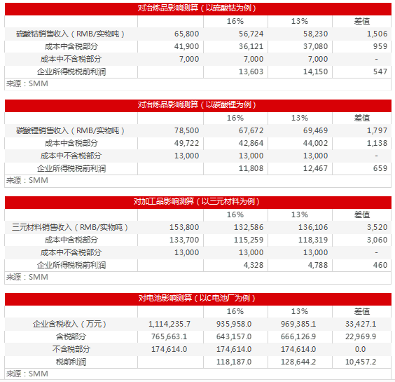 经测算,对增值税改革反应最大的是加工品(三元材料为例)利润,改革后利润增长10.63%;其次是电池行业,为8.8%;冶炼品的利润变化敏感度最低,碳酸锂及硫酸钴利润的增幅分别为5.58%及4.02%。加工品行业营业成本中含税比例较高,且利润率较低,因此增值税稍有改观,企业的利润变化幅度即表现十分显著。冶炼品(如硫酸钴)的不含税成本虽然占比不高,但利润率尚可,因此增值税变动对其利润影响较低。