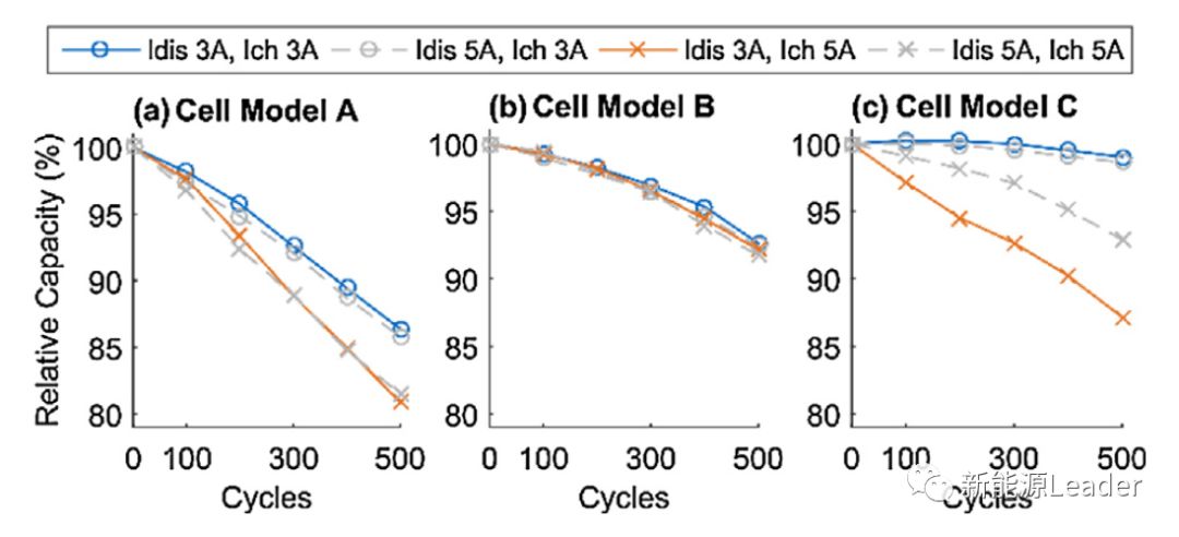 Peter Keil的工作表明,对于电池循环寿命影响最大的为充电电流,对于电池A和C在5A大电流下进行充电时会导致锂离子电池的循环寿命严重缩短,但是电池B的循环寿命似乎受充电电流的影响不大。其次是电池的充电截止电压,高的充电截止会严重的缩短锂离子电池的使用寿命,特别是对于电池B和C将充电截止电压提高50mV就会严重的影响电池的循环寿命。
