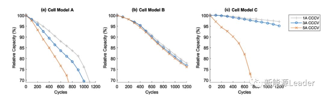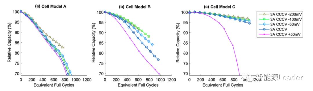 下图为采用CCPC和PC充电策略的三种电池的循环数据,可以看到对于三种电池采用CCPC充电策略时,电池的循环寿命实际上与采用相同充电电流的CCCV充电策略是相同的。