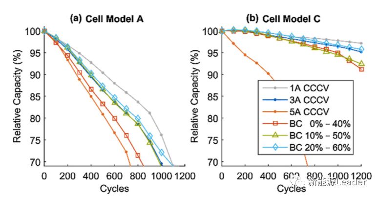 下图为电池A和C采用BC充电策略的循环性能,从图中能够看到对于电池A,如果从0%开始采用加速充电(5A)则会导致电池的衰降速度显著增加,与5A电流的CCCV充电策略接近。而如果从10%SoC和20%开始加速充电,则循环寿命会大大改善,与3A电流的CCCV充电策略接近。而对于电池C,如果开始加速充电的SoC为0%和10%则会导致电池的衰降速度明显加速,而如果在20%SoC开始加速充电,则对于电池的循环寿命的影响较小。这也表明在较低的SoC下进行加速充电会导致电池的循环寿命受到显著的影响。