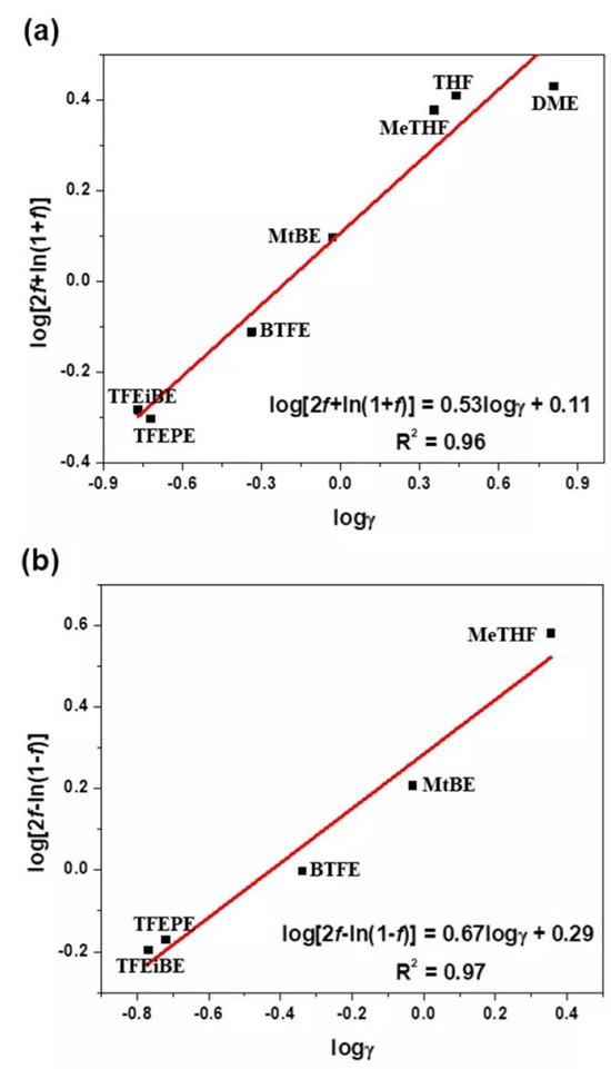 (b) 不同溶剂,充电容量为1050 mAh g-1的log[2f-ln(1-f)]与logγ关系曲线。