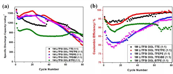 图2 1.0M LiTFSI加1:1 DOL:TTE,1:1 DOL:TFETFE,1:1 DOL:TFEPE,1:1 DOL:TFEiBE 和1:1 DOL:BTFE电解质的Li-S电池的(a)容量保持率和(b)库伦效率。