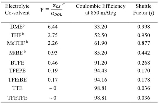 表1 不同电解质共溶剂的Li-S电池在850 mAh g-1放电容量下的γ、CE和f值。