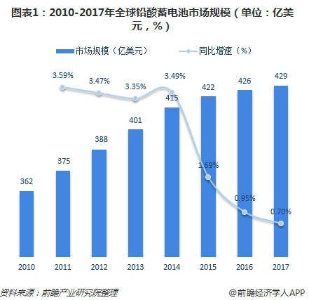 数据显示,2010-2017年,全球铅酸蓄电池市场规模稳步增长。2013年,全球铅酸蓄电池市场规模首次突破400亿美元,此后均保持在400亿美元以上。2017年,全球铅酸蓄电池市场规模约为429亿美元,同比增长0.70%。