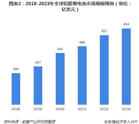 据统计,2015年铅酸蓄电池占电池市场一半以上份额约为54.67%。从全球范围来看,2015年铅酸蓄电池市场规模为422亿美元,这一市场规模仍将保持2%-5%的年增长率,预计2018-2023年,铅酸蓄电池市场规模难有大幅度上涨,但仍将维持在400亿美元水平上。