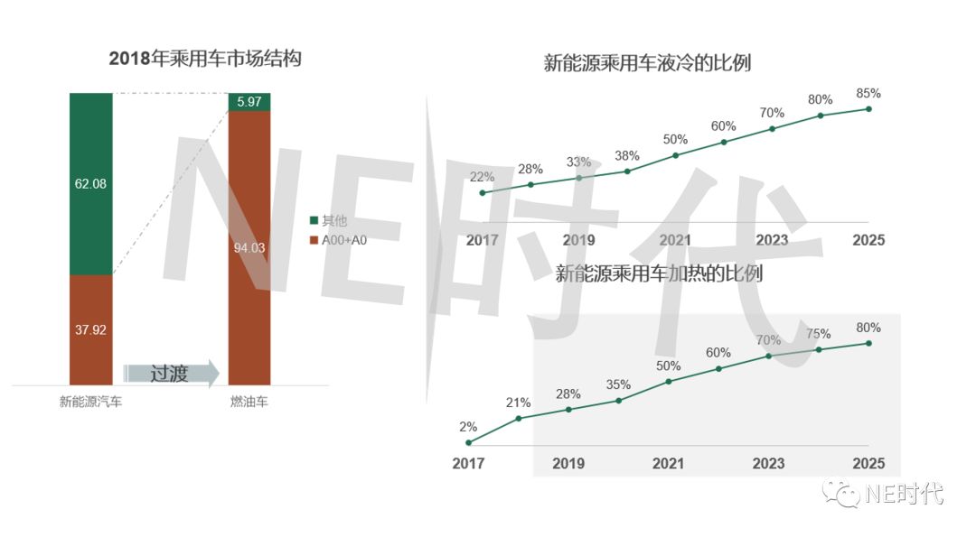 但随着补贴退坡,和新能源市场的进一步推广,新能源乘用车的市场结构将会逐渐趋向于传统乘用车,即A00和A0级别的车型比例会下降,而其他车型比例将上升。随着A00级别的份额下降,液冷系统的比例将迅速扩大。