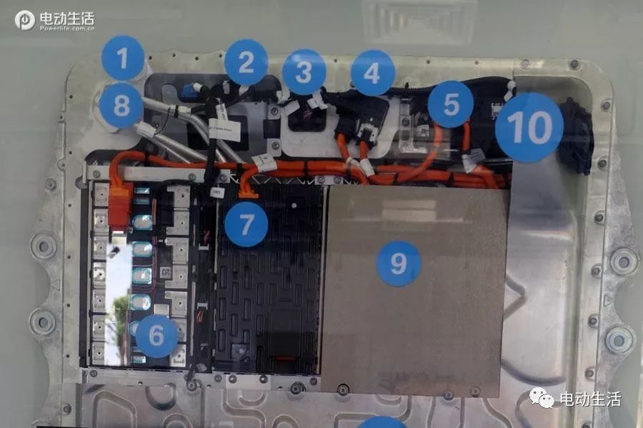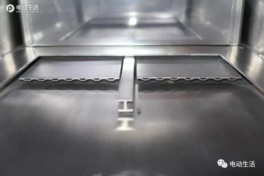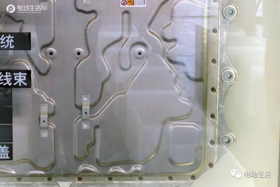由于这个电池包带有液冷系统,因此冷却液通过下箱体与电芯之间,带有液体流通管道的冷却液导板。由于样品被遮挡,我们用I-PACE的电池箱体做示意,原理基本一样。