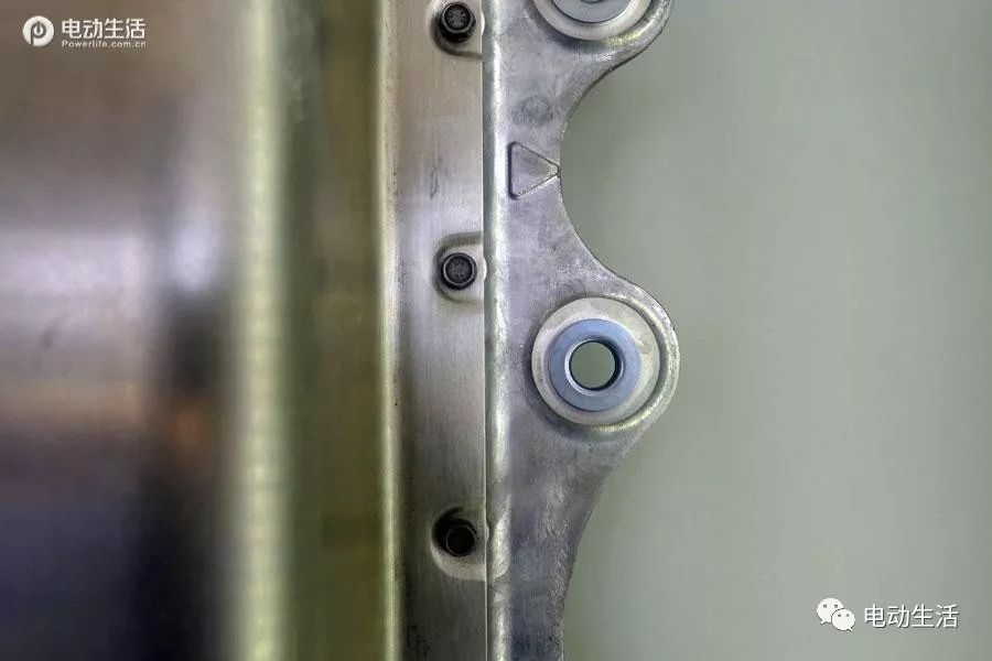 这是电池的下底部,也就是面对地面的部分,为了减重采用铝合金材质。这个部分相当于咱们吃饭的饭盆,所有的东西都要被装到这个饭盆里。图为这个饭盆...哦不,是下箱体固定车身连接用的螺丝孔位。