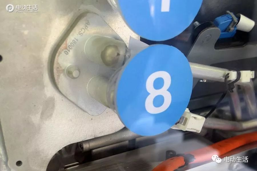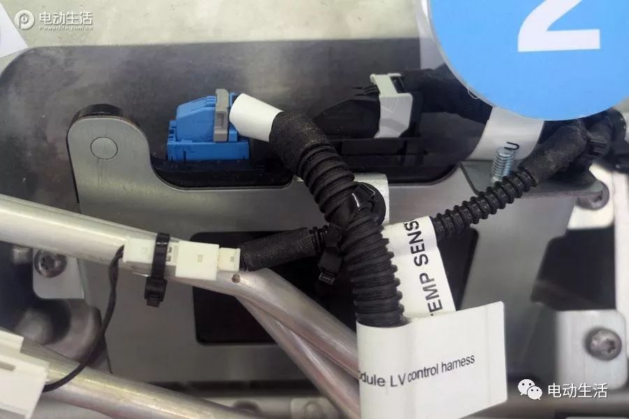 由于电池包采用液冷系统,因此这里是液冷管路的接口,外部链接水泵与散热片,将电池内部多余的热量通过液体管路带出,保持电池组工作在适当的温度之下。