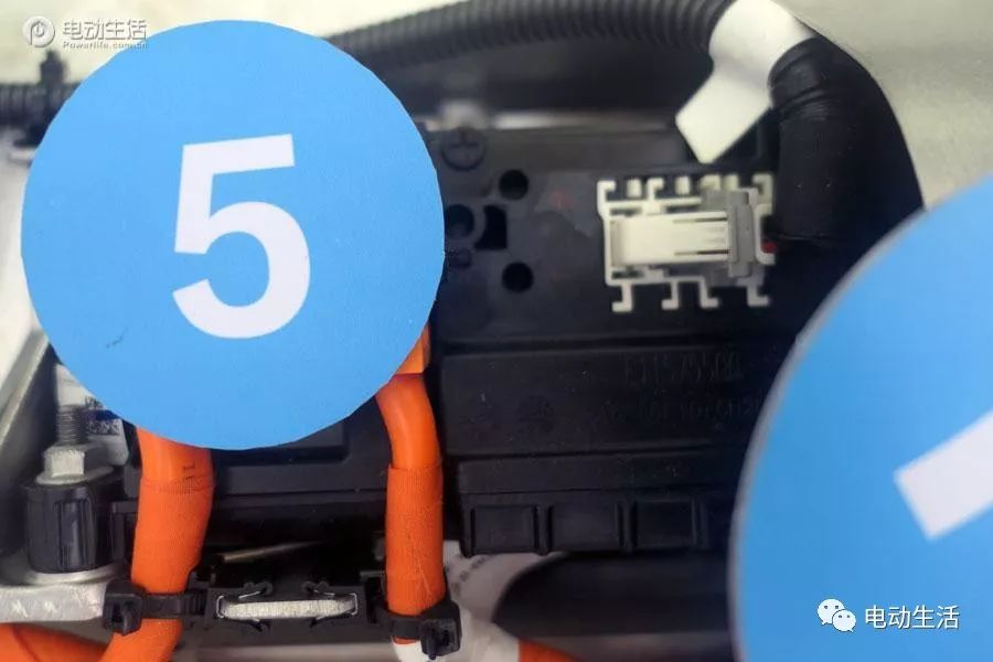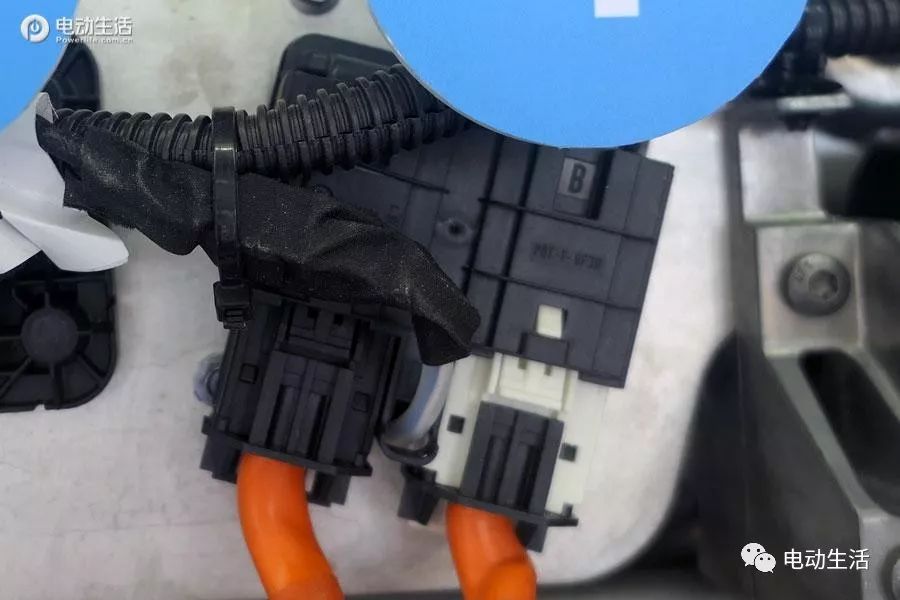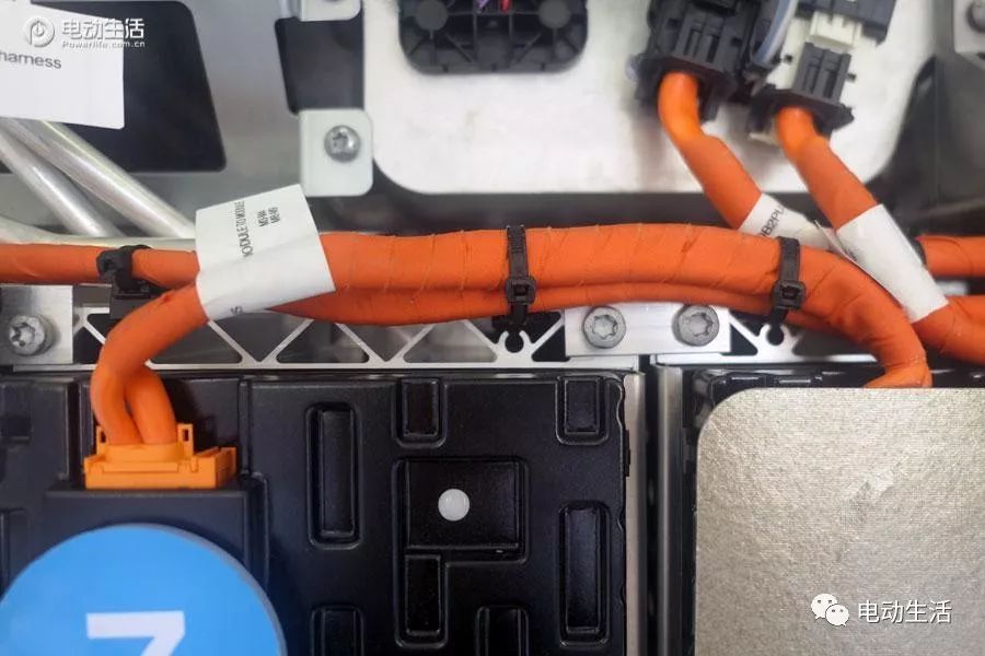 在电池包内的高压线需要经受高温高压的考验,因此凡是涉及动力电池高压线部分,全都会采用这种橘色绝缘布缠绕包裹的高压线材。这没什么可多说的,这条就过了。