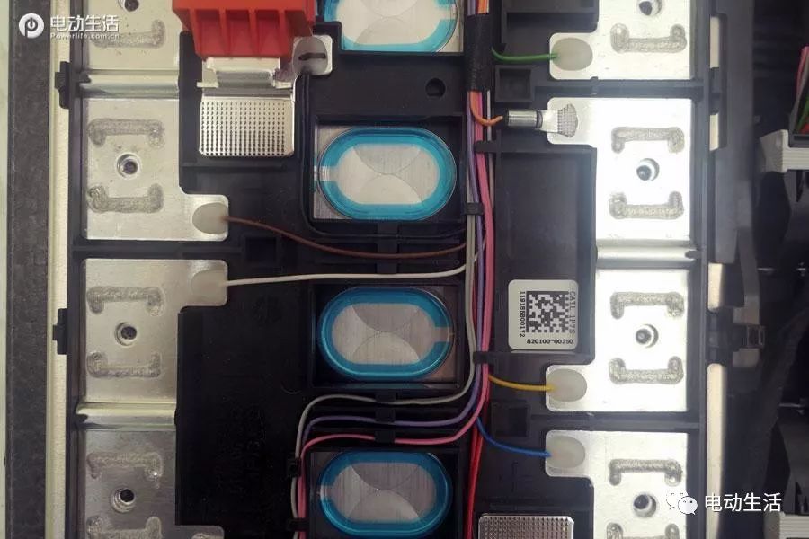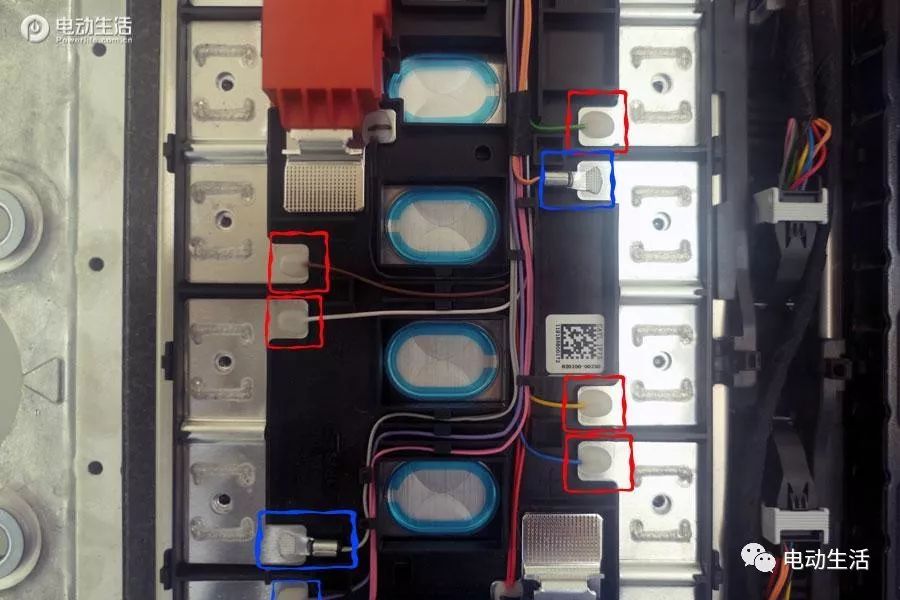 照片中红色框体内的,是检测电压数据的数据线,而篮框部分的则是检测温度的传感器数据线,而那个被压成小扁片样子的接头,其实是一个小的温度传感器。所以大家可以看到,红色的电压监控数据每个电池模组上都有;而蓝色框的温度检测数据线,每隔一个电芯模组才有一个。