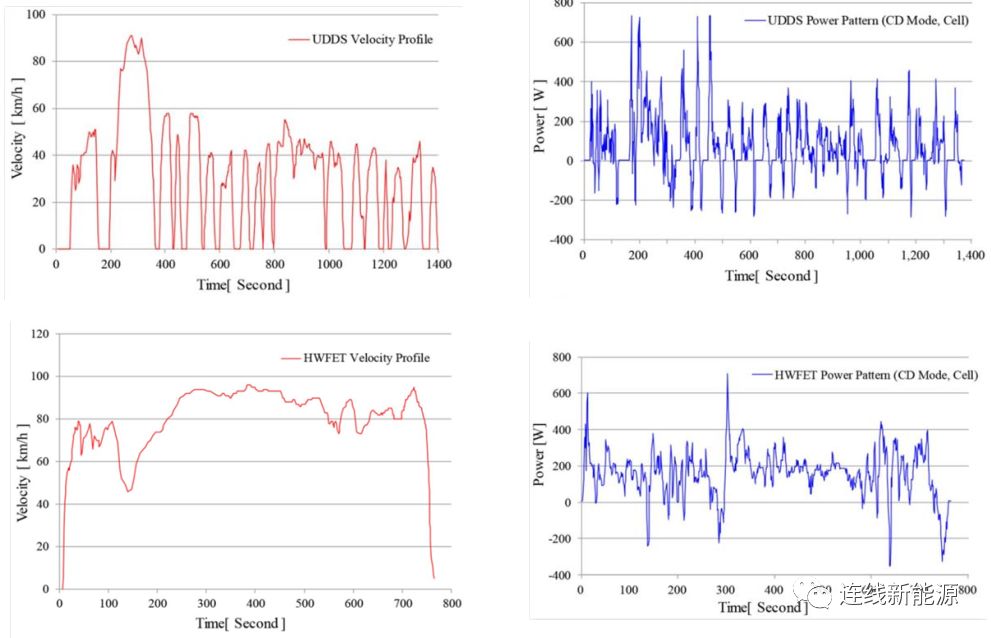 图3. 两种电量消耗模型的放电模式。其一来自于UDDS (EPA UrbanDynamometer Driving Schedule)速率曲线,其一来自HWFET (HighwayFuel Economy Cycle)速率曲线。