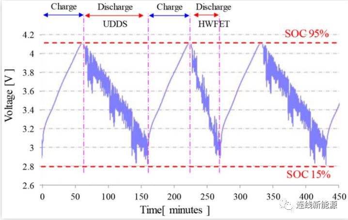 实验装置都准备好了,下一步就是确定电池循环测试方案了。由于本研究最终的服务对象是PHEV,因此作者考虑了车辆充电和驾驶时两种状态,同时考虑了图3所示的两种电量消耗模型的放电模式,并基于此得到图4所示的电池循环测试方案。电池循环DOD为15%-95%,采用CC-CV模式充电,充电倍率1 C。一个单独循环耗时约5 h,对应的能量大概可行驶105 Km。
