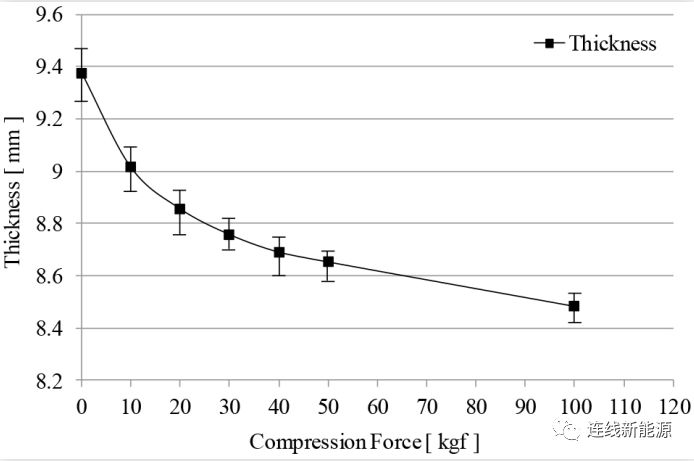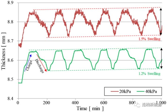 图7中可以清晰看到循环测试中充电过程和放电过程电池的厚度变化。如果初始约束压力为20KPa,那EOL阶段电池厚度将增长初始厚度的5-7%。