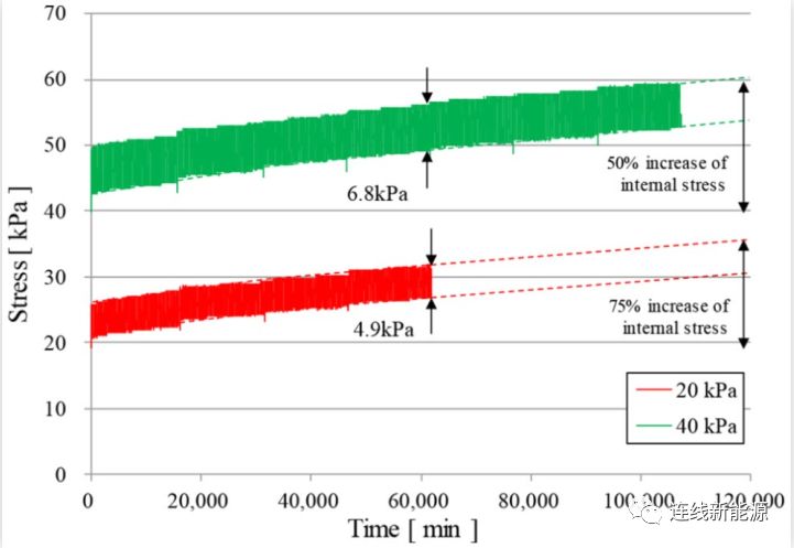 图6. 电池分别在20 KPa和40 KPa初始压力下循环电池压力变化。