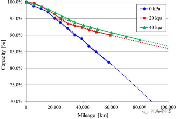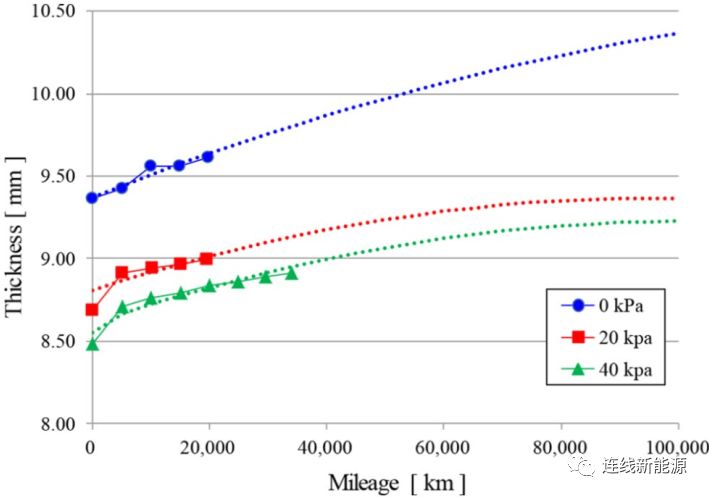 图8. 电池分别在20 KPa和40KPa初始压力下电池厚度随车辆行驶里程变化。