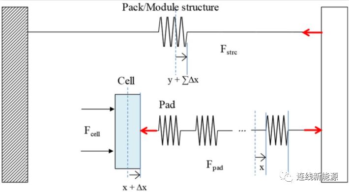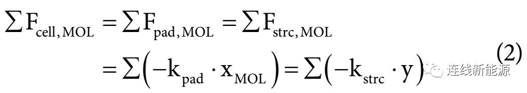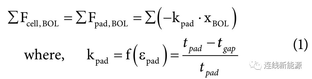 由以上分析不难看出,pack结构设计时需同时考虑软包电池、模组、pack构件和压缩片的力学特征。BOL电池的受力有压缩片的弹性系数(kpad)和变形量(εpad)决定,具体如公式(1)所示: