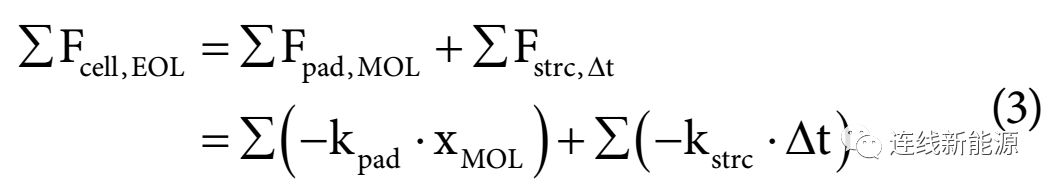 在EOL阶段,电池厚度的进一步增加将导致pack结构发生变化,此时电池受力为压缩片和pack结构的贡献之和,具体如公式(3)所示: