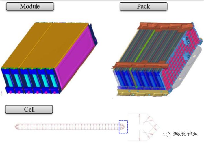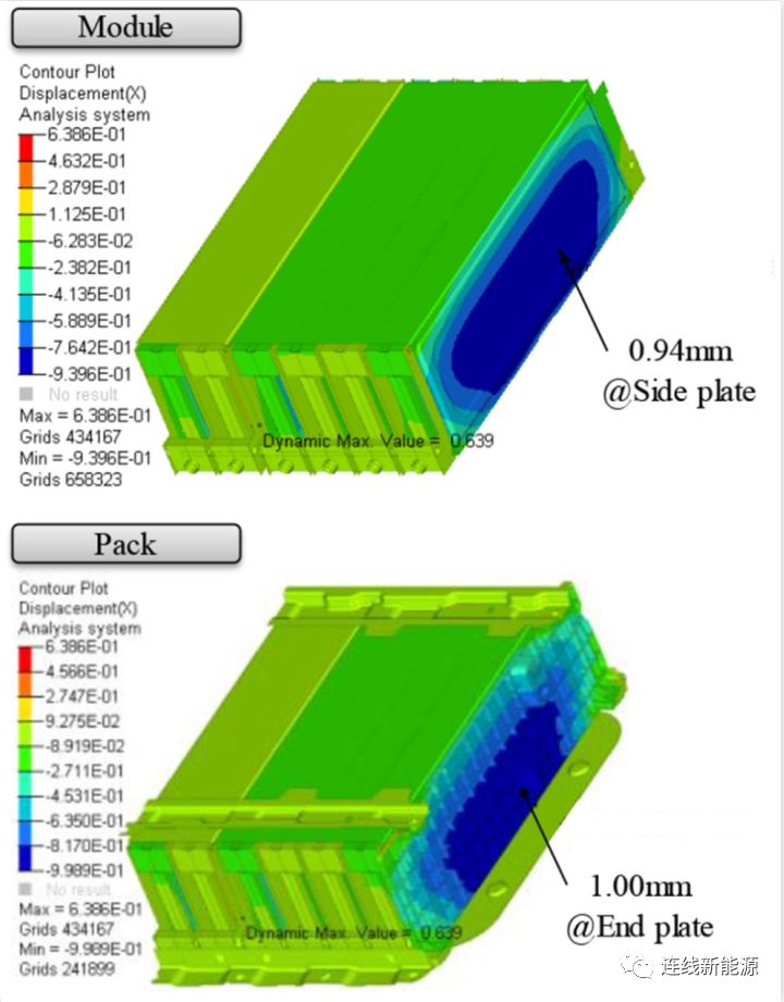 图14. 仿真得到的电池EOL阶段电池、模组和pack变形。