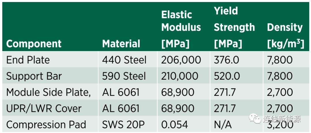 为了验证模组和pack结构能否承受EOL阶段电池内部压力,作者用OPTISTRUCT V14软件进行了仿真分析。条件为:电池初始厚度8.8 mm,20KPa约束压力下压缩片厚度1.3 mm,压缩片的最大压缩量为80%、对应的作用力为367 kgf。根据以上条件,电池在寿命循环周期内总厚度变化为初始厚度的5%。