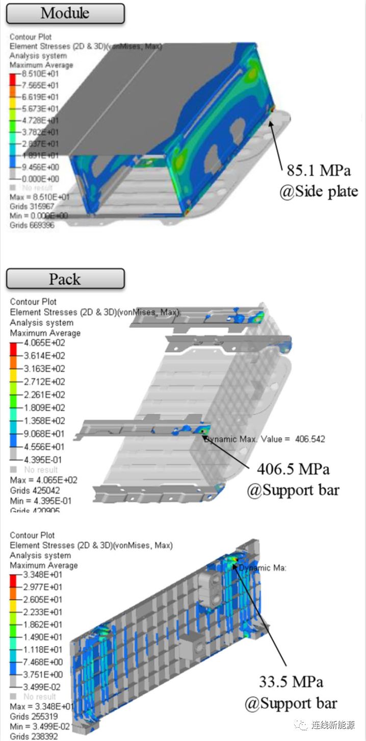 图15. 仿真得到的电池EOL阶段电池、模组和pack受力。