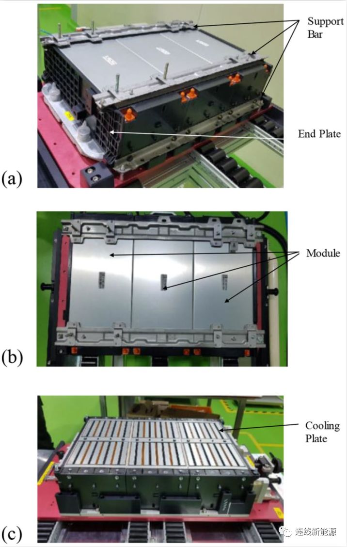 在摸清楚软包电池不同约束压力下BOL和EOL电池厚度及内压的变化的基础上,作者设计了如图10所示的模组和pack。其中每个模组包含四个子模组,一个字模组内含4个软包电池。每个电池之间都包含冷却板,每两电池之间隔着压缩片以维持电池的内压。可通过控制压缩片的不用压缩厚度来控制电池的初始约束压力。
