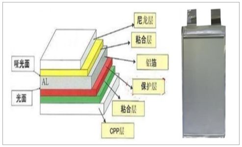 铝塑膜是由外层尼龙层(ON)、粘合剂、中间层铝箔(Al)、粘合剂、内层热封层(CPP)构成的多层膜,是软包锂电池的封装材料。电池用铝塑膜被要求具备如下特点: