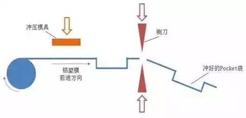 铝塑膜成型工序,软包电芯可以根据客户的需求设计成不同的尺寸,当外形尺寸设计好后,就需要开具相应的模具,使铝塑膜成型。成型工序也叫作冲坑,顾名思义,就是用成型模具在加热的情况下,在铝塑膜上冲出一个能够装卷芯的坑,具体的见下图。