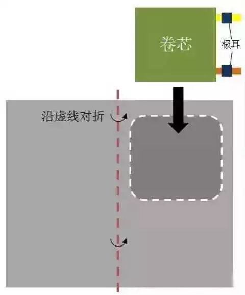 顶侧封工序,顶侧封工序是软包锂离子电芯的第一道封装工序。顶侧封实际包含了两个工序,顶封与侧封。首先要把卷绕好的卷芯放到冲好的坑里,然后沿虚线位置将包装膜对折,如下图所示。