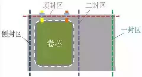 下面这种图是铝塑膜装入卷芯后,需要封装的几个位置,包括顶封区、侧封区、一封区与二封区。下面分别进行介绍。