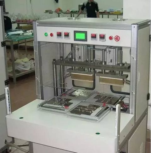 把卷芯放到坑中之后,就把整个铝塑膜可以放到夹具中,在顶侧封机里进行顶封与侧封了。顶侧封机是这样子的: