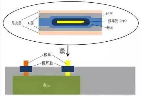 还是主要来说说顶封,顶封区域的示意图如下图所示。顶封是要封住极耳的,极耳是金属(正极铝,负极镍),怎么跟PP封装到一起呢?这就要靠极耳上的一个小部件—极耳胶来完成了。极耳胶具体的结构我不是很清楚,希望有懂行的人来补充。我只知道它也有PP的成本,也就是说在加热时能够熔化黏结。在极耳位的封装见下图中圆圈部分所示。封装时,极耳胶中的PP与铝塑膜的PP层熔化黏结,形成了有效的封装结构。