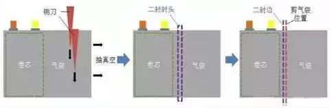 二封工序,刚才说了化成过程中会产生气体,所以我们要将气体抽出然后再进行第二次封装。在这里有些公司成为两个工序:排气与二封,还有后面一个剪气袋的工序,这里我就一起笼统的都称为二封了。