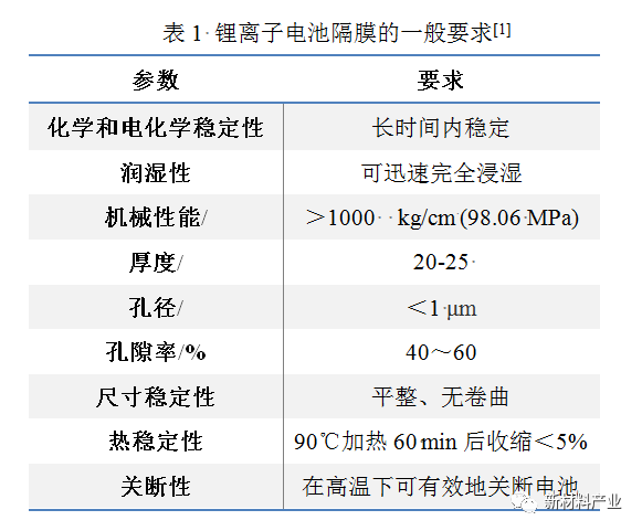 锂离子电池由以下5个部分组成:正极材料、负极材料、有机电解质、隔膜和电池外壳。其中,隔膜是锂离子电池的关键组成部分之一,有2个至关重要的作用:①在正负极之间起电子绝缘的作用,具有良好绝缘性的隔膜为电池提供了良好的安全保障,且良好的穿刺强度和抗拉强度可以防止隔膜被毛刺和枝晶穿破从而出现短路,此外,隔膜的厚度和热稳定性也是影响锂离子电池安全的主要因素。②为锂离子提供迁移微孔通道,决定着电池的充放电和循环性能,因此隔膜需要具有较高孔隙率且微孔分布均匀。表1总结了锂离子电池隔膜需考虑的一般要求。