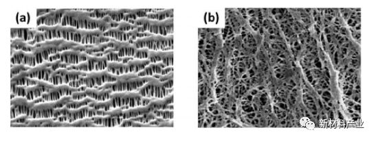二、锂离子电池隔膜的研究现状 根据不同的物理、化学特性,锂离子电池隔膜材料可分为以下几种类型:微孔隔膜、改性微孔隔膜、无纺布隔膜、复合膜和电解质膜。微孔隔膜可分为单层和多层微孔膜,主要取决于层数。改性微孔隔膜是通过对传统的微孔隔膜表面改性得到的,通常所用的改性方法为等离子体和辐射引发接枝或在表面涂覆一层不同的聚合物。无纺布隔膜由缠绕的纤维结合在一起组成网状结构,采用熔喷法、湿铺法和静电纺丝技术制备,由于具有小的纤维直径,无纺布隔膜相对其他隔膜有高的孔隙率。复合隔膜通过对微孔膜或无纺布膜涂层或填充无机材料制备得到,因此他们具有优异的热稳定性和润湿性。 1. 微孔隔膜 微孔隔膜的研究主要集中于PE、PP单层隔膜和PE/PP和PP/PE/PP等多层复合隔膜。美国Celgard公司制备的单层PP隔膜处于全球领先地位且拥有专有的PP/PE/PP三层隔膜技术。这些聚烯烃微孔隔膜广泛应用的原因在于其可以提供良好的机械性和化学稳定性且生产成本较低。但由于这一类聚合物普遍熔点较低(PE在130℃左右时熔化),当电池由于长时间工作而温度升高时,微孔聚烯烃隔膜易发生热收缩导致大面积正负极接触,引发短路从而造成电池起火爆炸。此外,聚烯烃微孔隔膜较差的电解液浸润性使得电池的电化学性能无法进一步提高。 针对于这一类材料的特点,研究者从制备工艺改善的角度出发来提高微孔隔膜的综合性能。一般来说微孔隔膜的制备方法有2种,工艺上称为干法(熔融挤出拉伸法,MSCS)和湿法(热致相分离法,TIPS)。干法的原理是聚烯烃加热熔融后在较高的挤出牵伸应力场下形成片晶结构,拉伸后晶体破裂产生大量纤维,留下微孔,经过热定型将其固定。干法工序简单且生产效率高,不会产生污染物质,但无法精确地控制隔膜的孔径和孔隙率。湿法的工艺思路在于将室温下互不相溶的结晶性高聚物与稀释剂(高沸点、低挥发性的小分子液体)混合,加热后溶化形成均相溶液,再进行降温工序使其产生相分离,压制得到膜片,用萃取剂脱除稀释剂后留下微孔结构,最终进行拉伸得到多孔隔膜。湿法工艺制备的微孔隔膜孔径小并且均匀但工艺复杂、成本较高,不易实现工业化生产。图1比较了由干法(裂缝状孔)和湿法(连通、椭圆形孔)制备的微孔隔膜的微观结构。 近些年,超高分子量聚乙烯隔膜(UHMWPE)的研发受到极大重视。其以下优点使得电池的安全性大大提高:①优异的抗外力穿刺能力降低了电池的短路率;②良好的耐热性能提高了闭孔温度和破膜温度;③高温环境下的尺寸稳定性和耐腐蚀性。赵忠华等按照一定的物料配比将UHMWPE(液体石蜡)粉状原料、二氧化硅(SiO2)(白炭黑)和石蜡油混合,挤出压延成片材后拉伸冷却定型,用二甲苯萃取石蜡油,形成微孔结构的薄膜。由于UHMWPE分子量大,可用溶剂少,目前湿法采用UHMWPE/LP二元体系制备锂电池隔膜,杨晓娟研究发现随着UHMWPE量的增大孔隙率不断下降。 2. 改性微孔隔膜 目前,在锂电池中广泛应用的隔膜是由聚烯烃尤其是微孔PE和PP膜制成的。然而聚烯烃隔膜的热稳定性和湿润性较差,为了改善这些性能,需采用一系列改性方法来改变微孔聚烯烃隔膜的结构。其中一种高效而简单的方法是在膜表面接枝亲水性单体,目前应用较多的接枝技术包括等离子体、UV照射和电子照射。Kim等采用等离子体处理接枝丙烯腈(AN)单体从而制造出改性PE膜,改善了电解质浸润性。Gineste等采用电子束接枝二乙二醇双丙烯酸酯(DEGDM)来改性微孔PP膜使其产生亲水性表面,对PP膜的改性提高了离子电导率和循环寿命。GMA和MMA也被采用电子束的方法接枝在PE膜表面。 此外,在微孔隔膜上涂覆一层不同的聚合物也是一种改性方法。Lee等介绍了一种将聚多巴胺(PDA)涂覆在PE隔膜上的改性方法,改善了表面润湿性和热稳定性。Sohn等报道了PVDF-HEP/PMMA涂覆的PE隔膜。Park等采用传统的乳液聚合方法制备了PMMA纳米粒子的胶体溶液,将PE隔膜选为基体涂层,溶剂挥发后PMMA纳米粒子在PE隔膜表面形成了有序、密集堆积的纳米阵列即均匀的多孔结构,与传统的PMMA致密涂层相比,这种独特的形貌提高了对电解液的浸润性和离子电导率,吸液率高达200%。陈博裕等在UHMWPE隔膜上涂覆了具有良好亲电解液性能的聚偏二氟乙烯(PVDF),从而使电池的性能和寿命均得到改善。K. W. Song等通过非溶剂致相分离法(NIPS)在PE隔膜上涂覆具有良好耐热性的多孔聚芳酯(PAR),改性后的PE膜闭孔温度保持不变(135℃)而熔融温度提高到188℃,使其在闭孔后依旧保持强健的机械性能,极大地提高了锂离子电池的安全性能。 3. 无纺布隔膜 无纺布通常是由随机取向的纤维通过化学和机械方法粘结而成。传统制备无纺布的方法为干法(熔喷法)、湿法(湿铺法)和造纸法,采用传统方法制备的隔膜具有相对大的纤维直径和孔径,通常用作铅酸电池的隔膜,不宜用在锂电池中。为了降低纤维直接和孔径,采用静电纺丝技术制备适用于锂电池的无纺布隔膜。静电纺丝法通过在注射器中的聚合物熔体或溶液与接收屏间施加高压静电力进行喷射拉伸,从而获得聚合物纳米纤维,如图2所示。静电纺丝法制备的纳米纤维无纺布具有孔径小且分布均匀、孔隙率高、吸液率高和比表面积高等优点。 许多聚合物可以被用来制备静电纺丝纤维膜。其中,聚偏氟乙烯(PVDF)由于具有优良的耐热和耐化学性以及