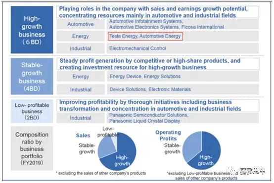 汽车动力电池归属于松下高速增长业务板块。松下将公司旗下各业务板块划分为高速增长、稳定增长和低盈利业务,其中高速增长业务包括汽车动力电池(含特斯拉)、车载信息系统、汽车电子等;稳定增长业务包括能源解决方案、电子材料等;低盈利业务包括半导体解决方案等。