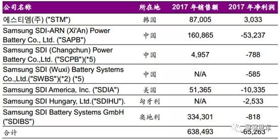 三星SDI已在韩国、中国、美国、匈牙利及奥地利等地布局了汽车动力电池的工厂。根据三星SDI的公告,2017年,韩中美欧四个地区的动力电池公司销售收入合计6,385亿韩元(人民币约40亿元),净利润合计-652.6亿元(人民币约-4亿元)。